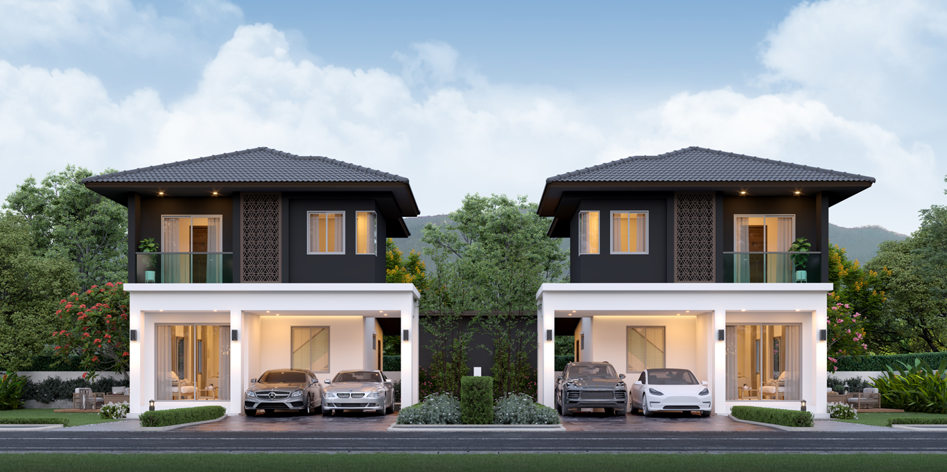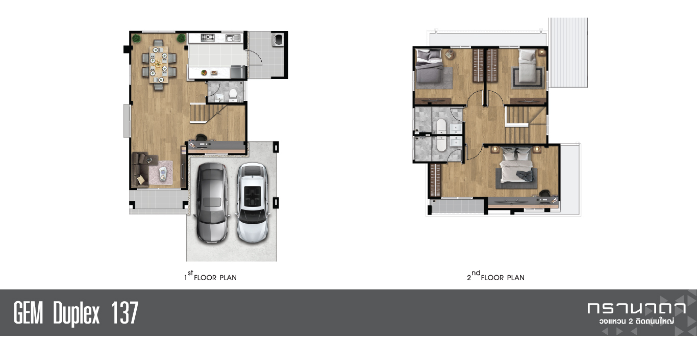 แบบบ้าน GEM Duplex 137 เป็นบ้านแฝดรุ่นใหม่ ที่ผนังไม่ติดกับใคร พื้นที่ใช้สอยตอบโจทย์ทุกไลฟ์สไตล์ ที่จอดรถ 2 คัน
