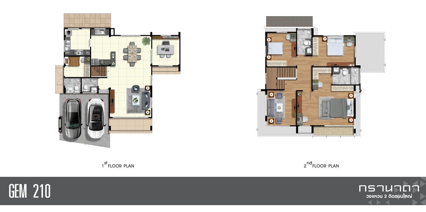 แบบบ้าน GEM 210 ทุกฟังค์ชั่นผ่านการคิดอย่างพิถีพิถัน สามารถใช้ประโยชน์ได้สูงสุด ห้องรับแขกที่กว้างและมีมุมสำหรับพักผ่อนบนชั้น ที่จอดรถ 2 คัน
